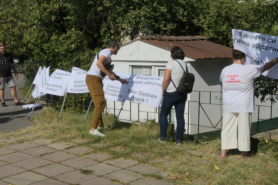 Те залепиха плакати на оградата против посолството на улица " Козяк " на български и британски език, на които написа: " Гешев е позор- Оставка ", " Свалете поддръжката от Гешев ", " Вие одобрихте Гешев, вземете си го ".