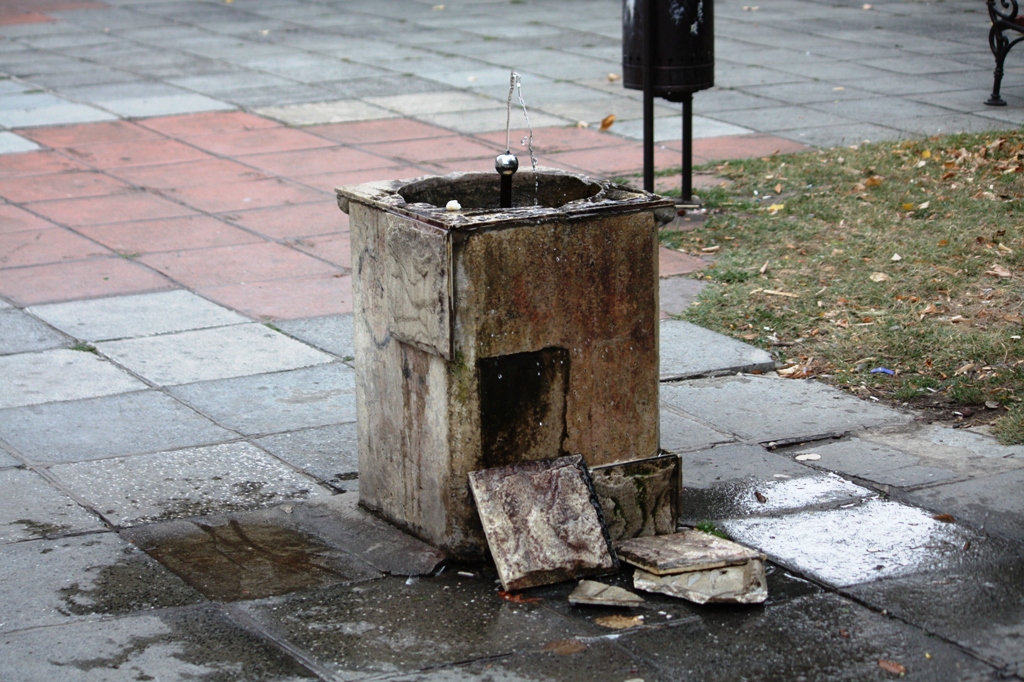 Единият проблем, който е явен, е положението на чешмичката. Нейната обшивка пада части от нея са разхвърлени в близост.