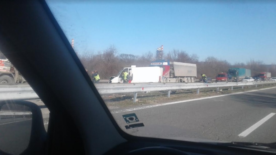 Катастрофа сред микробус и камион е станала на автомагистралата посока Шумен край Девня. Сигналът за случая е постъпил в 13:13ч. като за благополучие потърпевши няма, единствено материални вреди.