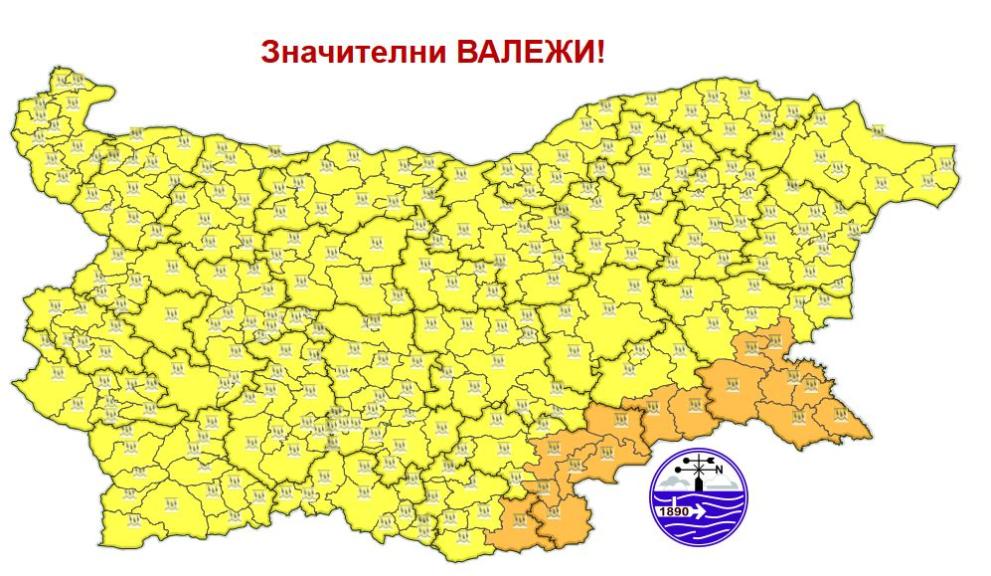 Оранжев и жълт код оповестиха от Националния институт по метеорология и хидрология (НИМХ) за на следващия ден, понеделник. Оранжев код е за областите Кърджали, Хасково, Ямбол и Бургас, предава Дарик. В останалата част от страната е в действие жълт код.