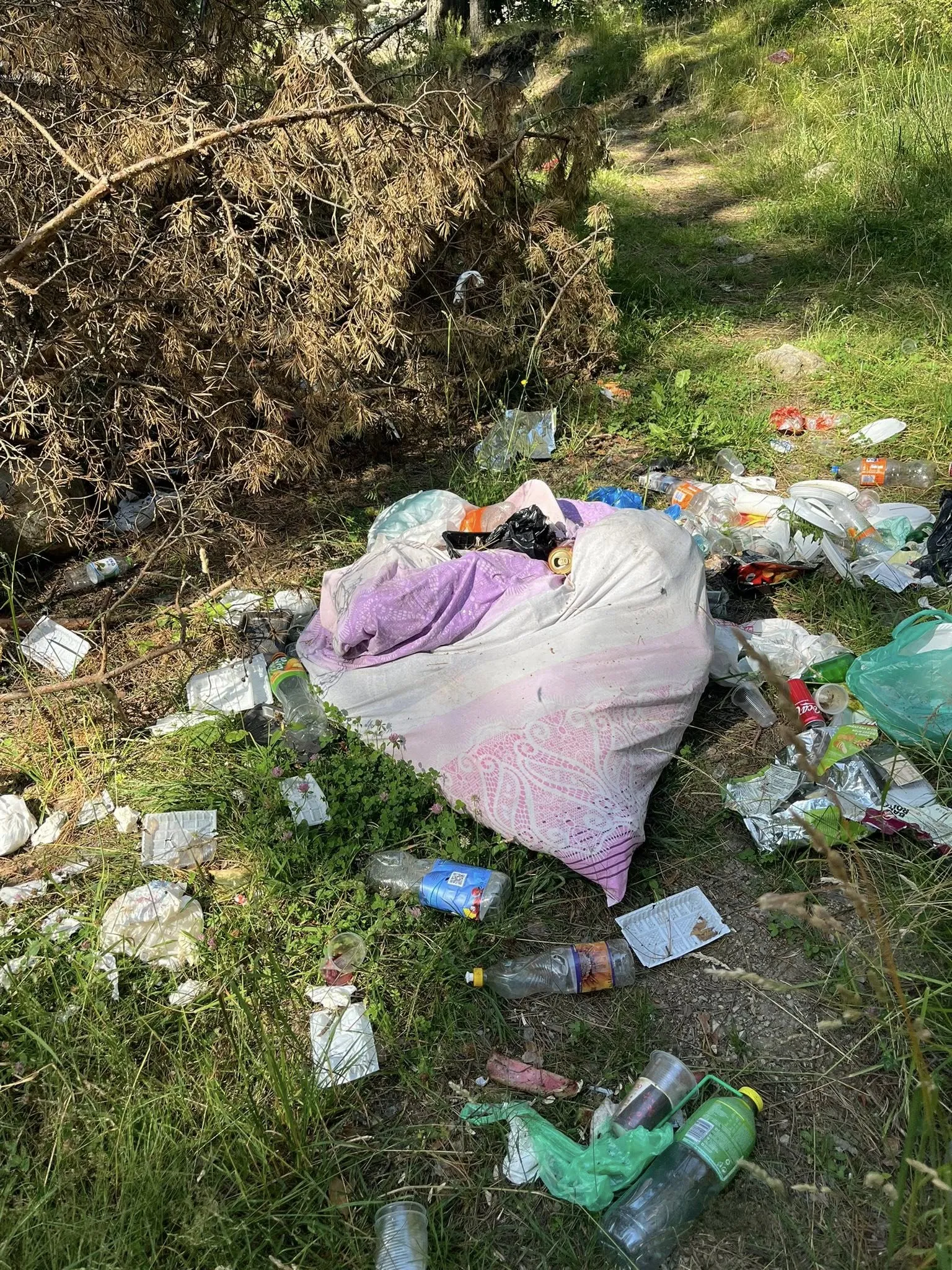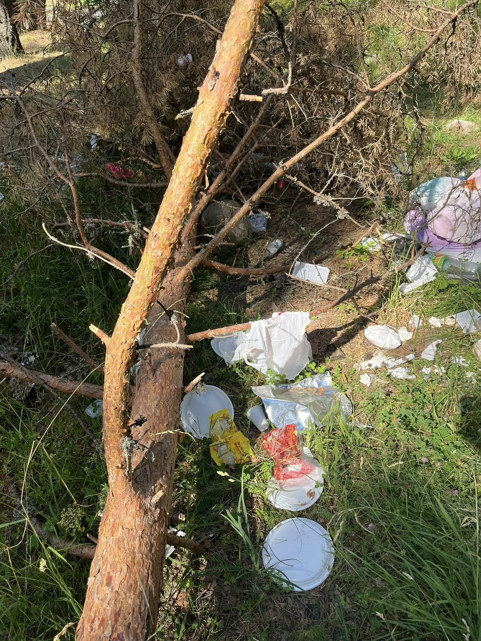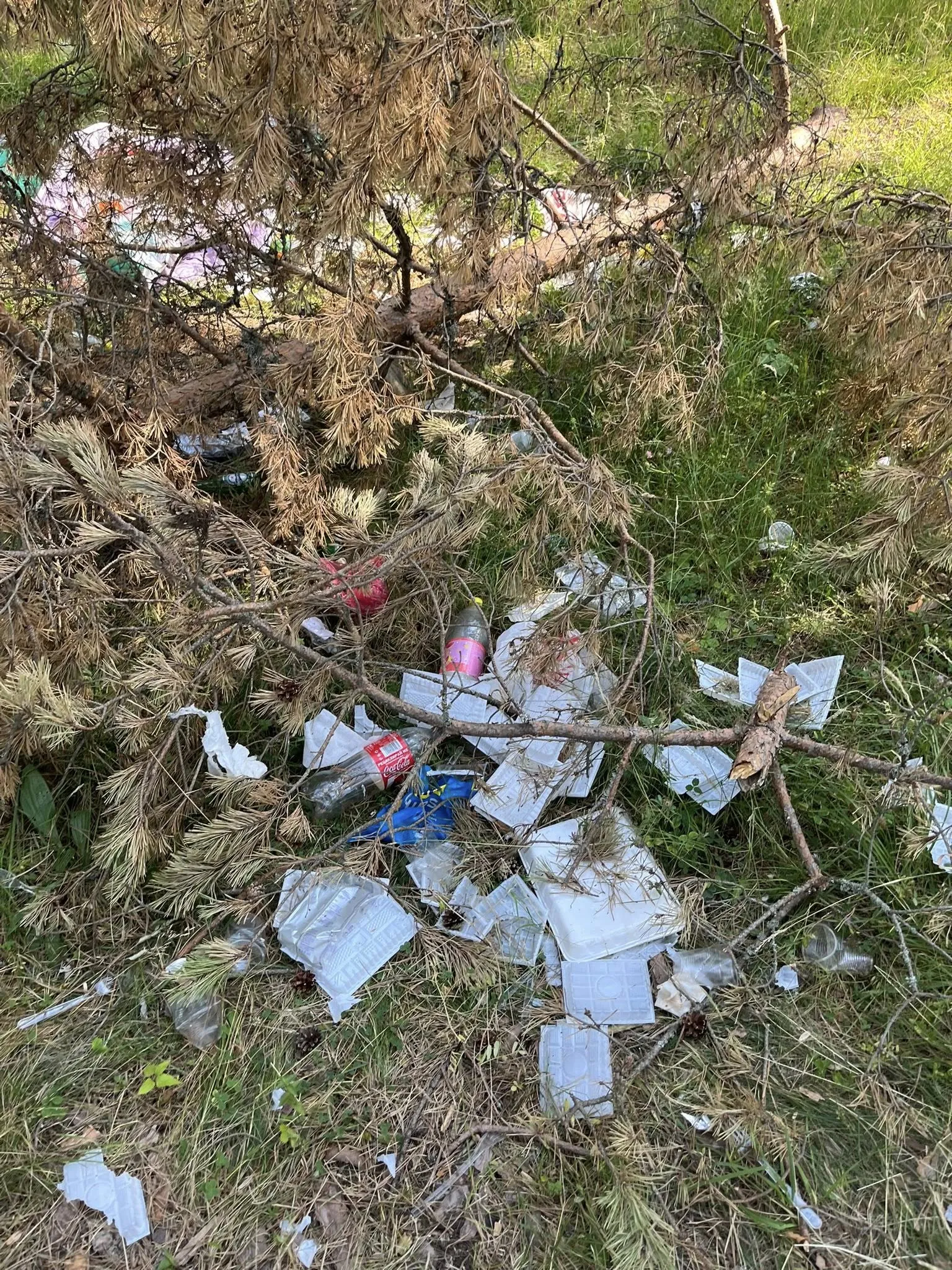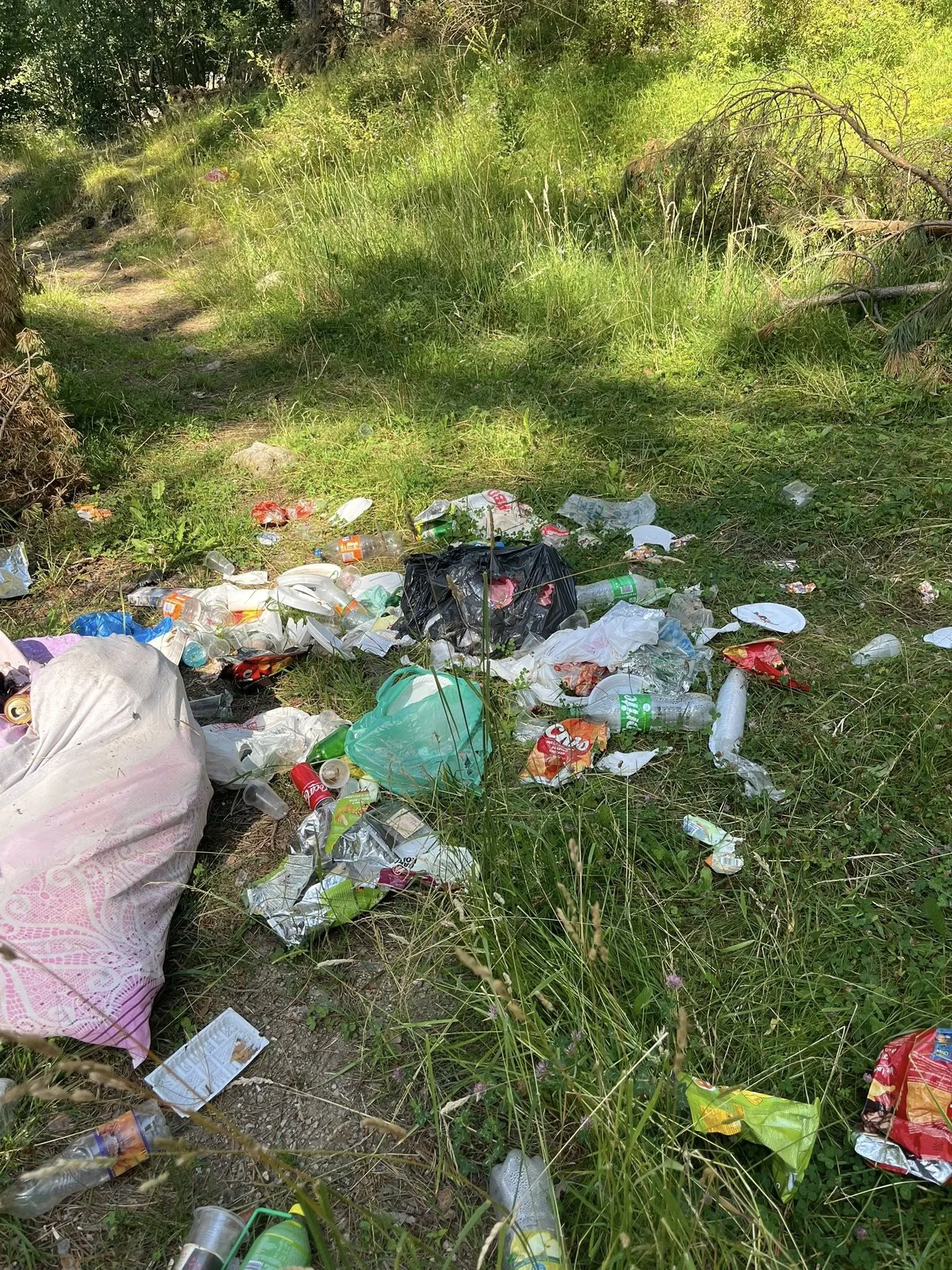 Разпилени пластмасови бутилки, чаши, торбички, хартии, чипсове и останки от храна покриват тревата. Сякаш някой е обърнал кошче за отпадък посред природата и просто си е тръгнал. Вместо следи от обувки, остават следи от безнаказаност и цялостно неуважение на околната среда.