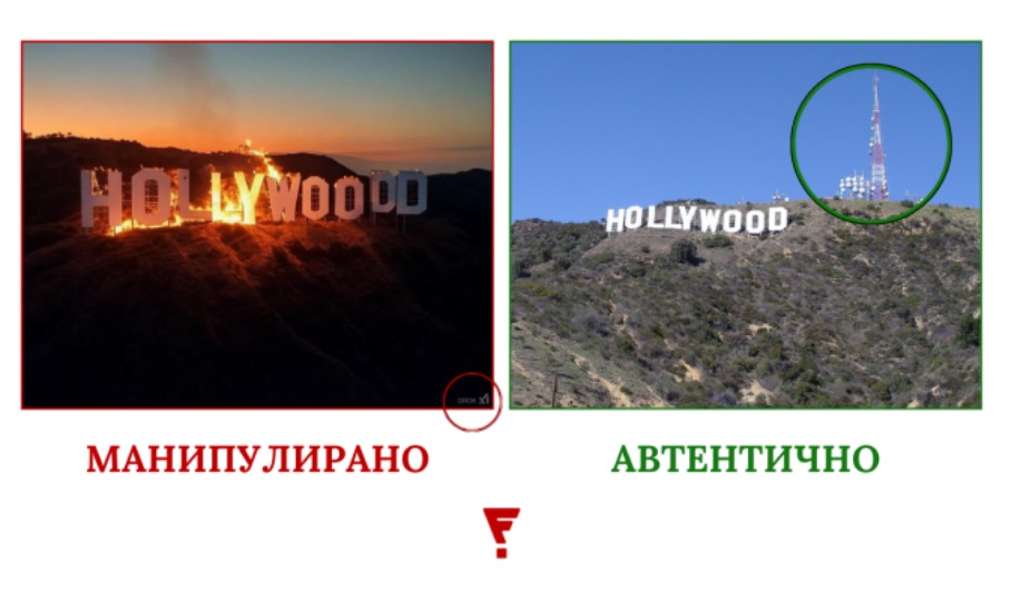 Снимките и видеата, на които се вижда надписът Hollywood, обзет от пламъци, са манипулирани;