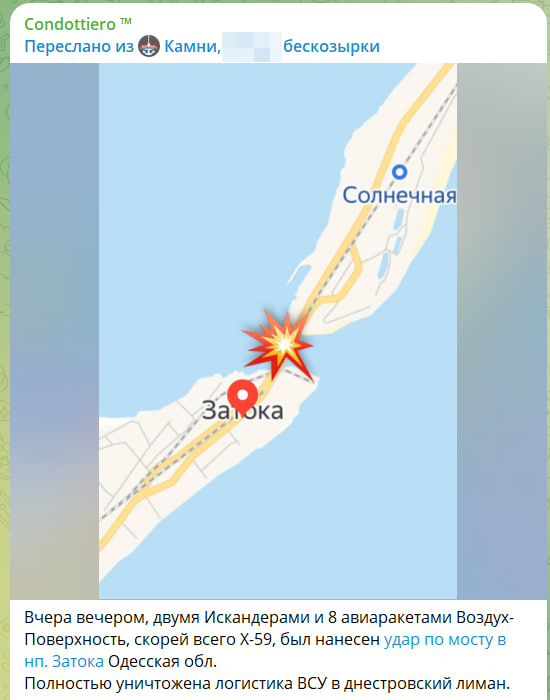 " Вчера вечерта два " Искандера " и 8 ракети " въздух-земя ", най-вероятно Х-59, поразиха моста в селото Затока Одеска област. Логистиката на украинските въоръжени сили в устието на Днестър беше изцяло унищожена. "