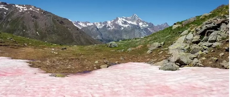 Снегът се оцветява в цвят на любеница поради водораслите Chlamydomonas nivalis. През лятото това растение създава червен пигмент, с цел да се защищити от мощната слънчева светлина. Подобен пигмент принадлежи към групата субстанции, с помощта на които, да вземем за пример морковите и доматите получават присъщ ослепителен цвят.
