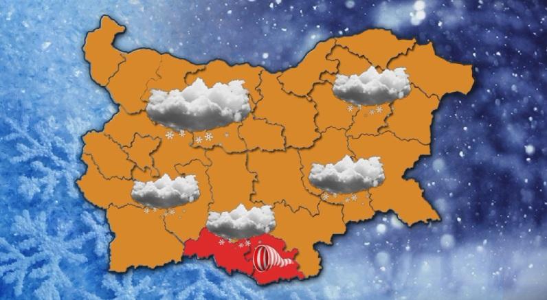 Сняг вали в цялата страна, а температурите през днешния ден ще бъдат фрапантно ниски. На доста места преваляванията ще са обилни и съпроводени от виелици. Червен код е въведен в областите Смолян и Кърджали. Там ще се чака нова снежна завивка към 40 см. В останалата част на страната е разгласен сигнален оранжев код. В Северозападна България ще има умерени, в планинските региони и мощни снеговалежи. Ще натрупа от 20 до 35 см. нов сняг.