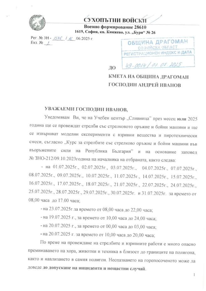 Снощи на публицистичната си поща Vesti.bg получи питане от гражданин на Костинброд. В него той прилага и атачмънт с разпоредба от Сухопътни войски - Военно формирование 28610 до кмета на Община Драгоман , за плануваните военни учения на Учебен център " Сливница ".