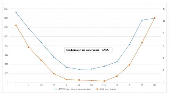 Стойностите за ФПЧ10 над нормата са най-вече през студеното полугодие. Друга наклонност е значителното понижаване на стойностите над нормата през топлото полугодие. През студените месеци половината от измерените стойности са над нормата, изключително за ноември, декември и януари. В същите тези три месеца са и стойностите в диапазоните 100 – 200, 200 – 300 и 300 – 400. През летните месеци единствено 10% от стойностите са над нормата, като през август има замерени едвам 5 стойности два пъти над нормата. Заключението е, че замърсяването с ФПЧ има ясно изразен сезонен темперамент.