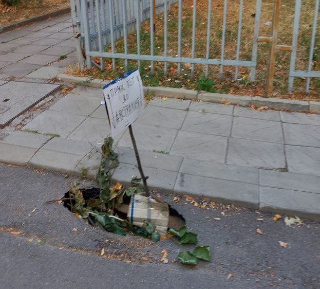 Софиянци откриха директен път до Австралия. Или най-малко с голяма доза възприятие за комизъм се пробват да предупредят водачи пешеходци за зейнала дупка в асфалта.