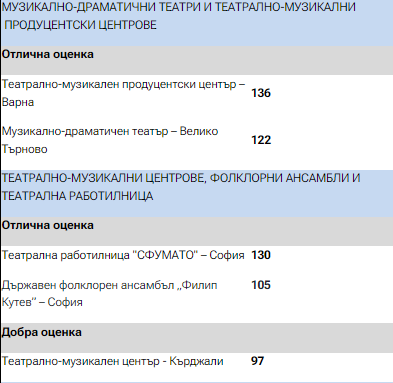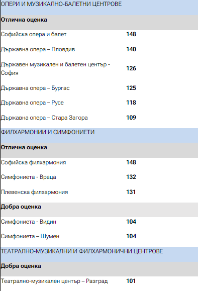 Ето и оценките на театри, опери, музикални театри, филхармонии и симфониети за 2023 година: