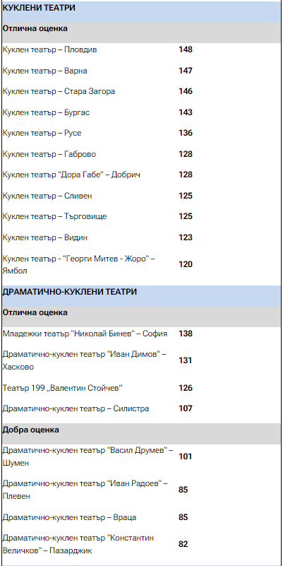 Сред отличниците са и куклените театри във Варна, Стара Загора и Бургас, които получават надлежно по 147, 146 и 143 точки, Народният спектакъл, Драматичният спектакъл в Пловдив и Пловдивската опера също са оценени с отлична оценка и имат по 140 точки.