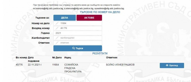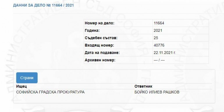 Справката демонстрира, че има дело с просител Софийската градска прокуратура и ответник Бойко Рашков. Това, което не е ясно е какъв е предметът на делото.