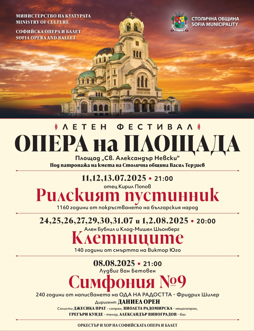Софийската опера и балет продължава традицията да показва огромни културни събития и през този летен сезон. През юли и август пространството към храм-паметника „ Св. Александър Невски “ още веднъж ще се трансформира в сцена за грандиозни спектакли навън.
