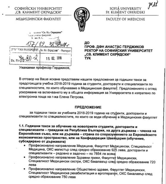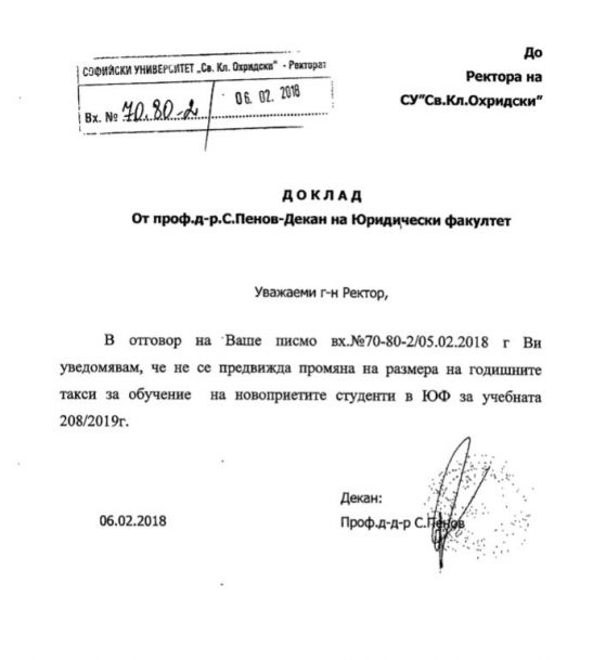 В отчета си до ректора проф. Анастас Герджиков деканът на Юридическия факултет проф. Сашо Пенов не предлага нарастване на таксите, само че такова проличава от общата таблица, направена в Ректората.