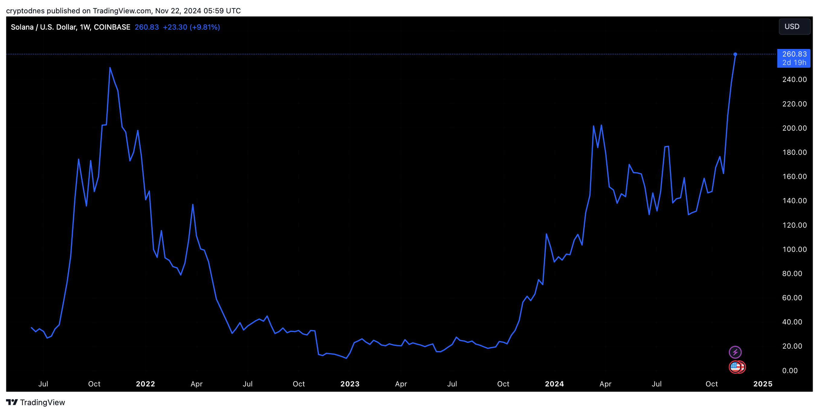 Solana (SOL) доближи нов исторически връх на 22 ноември, отбелязвайки доста възобновяване две години след срутва на борсата FTX, който намали цената на токена до под $10 през декември 2022 година