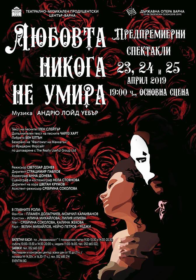 23, 24, 25 април 2019, 19.00, Варненска опера. Предпремиера на " Любовта в никакъв случай не умира " от А. Л. Уебър, взаимен план с ММФ " Варненско лято "