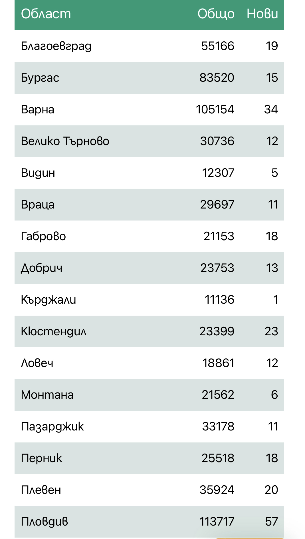 Заразени по Oбласти: