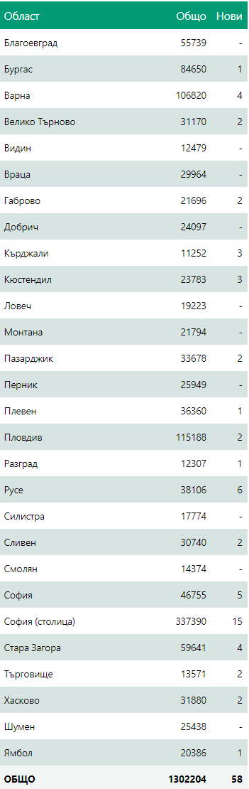Новозаразени в страната - 58 (65.52% неваксинирани)