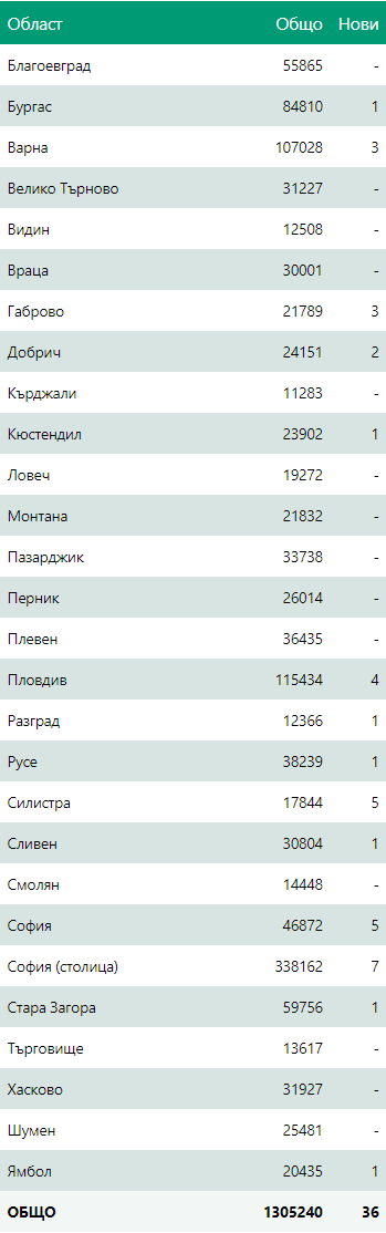 Новозаразени в страната - 36 (55.56% неваксинирани)