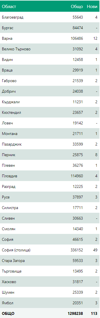 Новозаразени в страната - 113 (46.90%% неваксинирани)