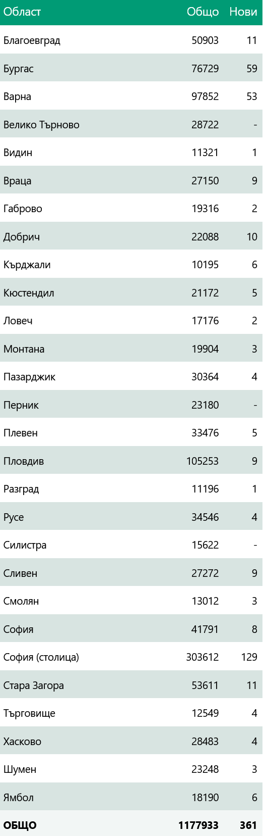 Новозаразени в страната - 361 (65.65% неваксинирани)