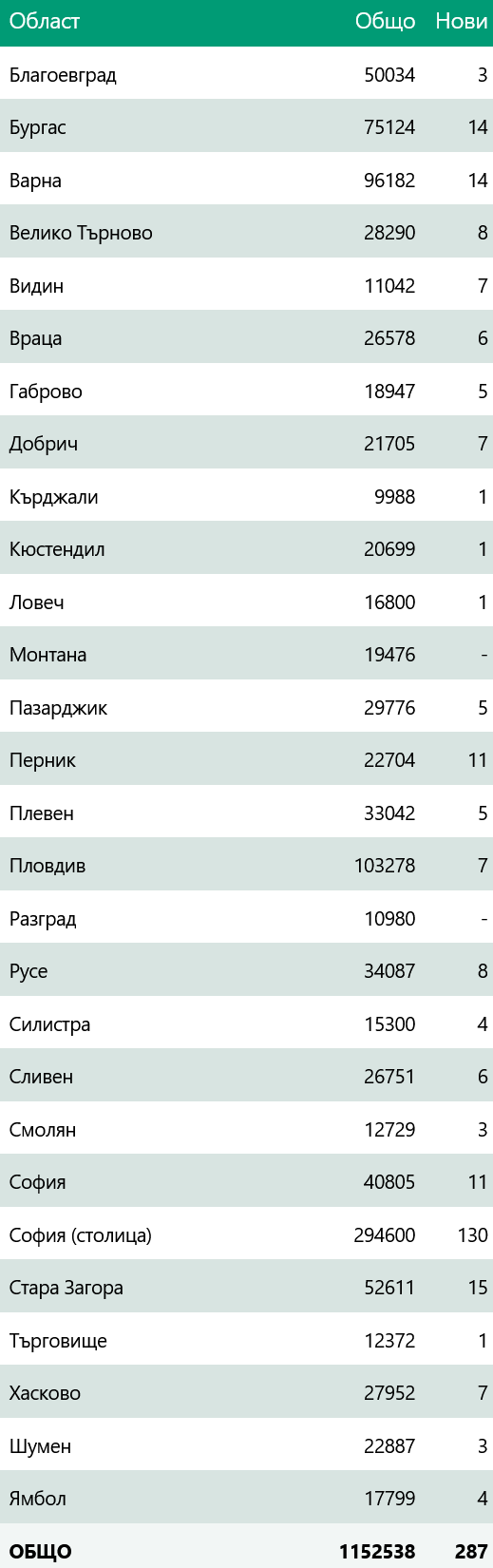 Новозаразени в страната - 287 (68.29% неваксинирани)