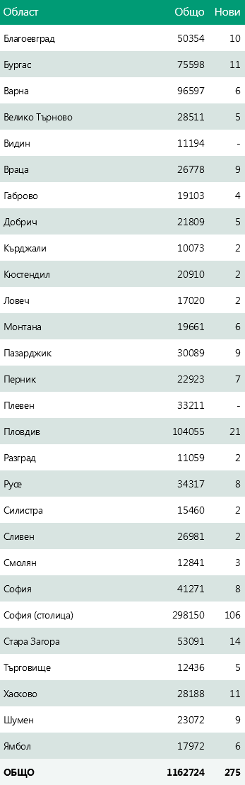 Новозаразени в страната - 275 (65.09% неваксинирани)