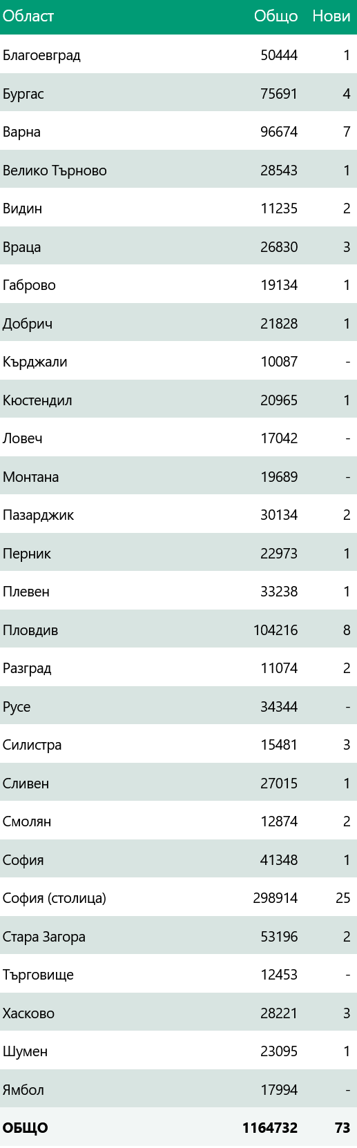 Новозаразени в страната - 73 (61.64% неваксинирани)