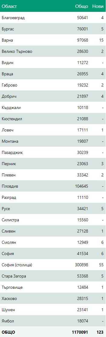 Новозаразени в страната - 123 (68.29% неваксинирани)