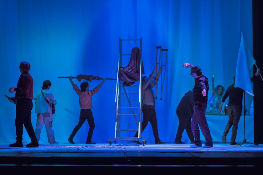 Постановката впечатлява и със мощна образна идея – изчистената сценография и костюмите на Мария Кунчева, както и музиката на Милен Апостолов построяват театрално пространство, в което всяко придвижване и всеки подробност съдържат символика.