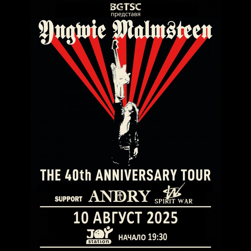 Специалният концерт на Ингви Малмстийн в София е съвсем разпродаден. Много стеснен брой почитатели ще могат да видят маестрото у нас на 10 август. Вдъхновителят на генерации китаристи ще изнесе знаков концерт у нас, отбелязващ четири десетилетия революционно въздействие върху рока, метъла и света на инструменталната музика! Концертът ще се състои от 19:30 часа на 10 август в столичния Joy Station, оповестиха уредниците от BGTSC.