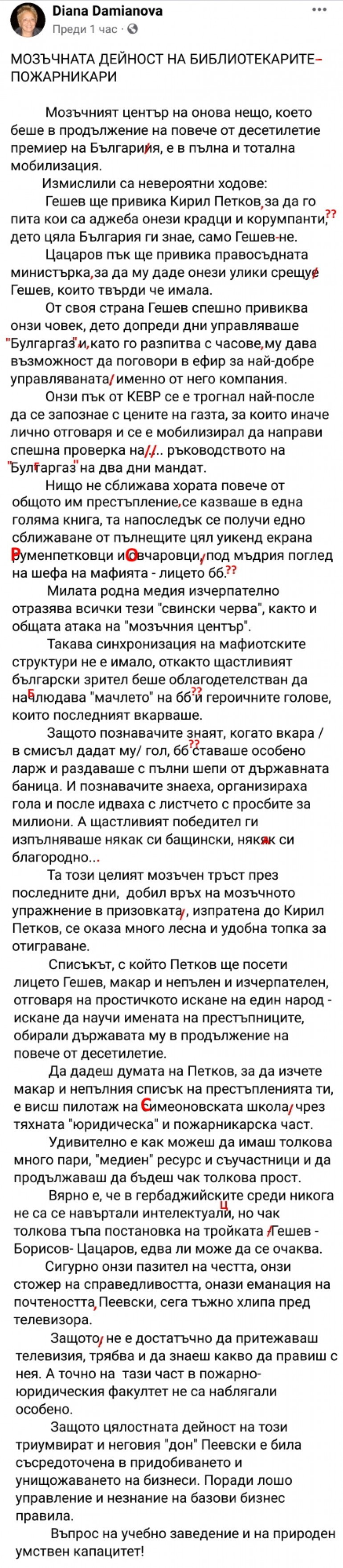 „ Списъкът, с който Петков ще посети лицето Гешев, въпреки и повърхностен и обстоен, дава отговор на простичкото искане на един народ – искане да научи имената на нарушителите, обирали страната му в продължение на повече от десетилетие “. Така пиарката на Кирил Петков Диана Дамянова отбрани решението на премиера да сформира лист с нарушители въз основата на вести, които е чел в интернет.