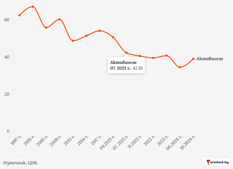 На парламентарни избори през юни 2024 година бе регистрирана рекордно ниска изборна интензивност – 34.41%. Дъното обаче се оказа надалеч – на провелите се през юни частични локални избори в София решилите да упражнят правото си на избор се оказаха не повече от 15%.