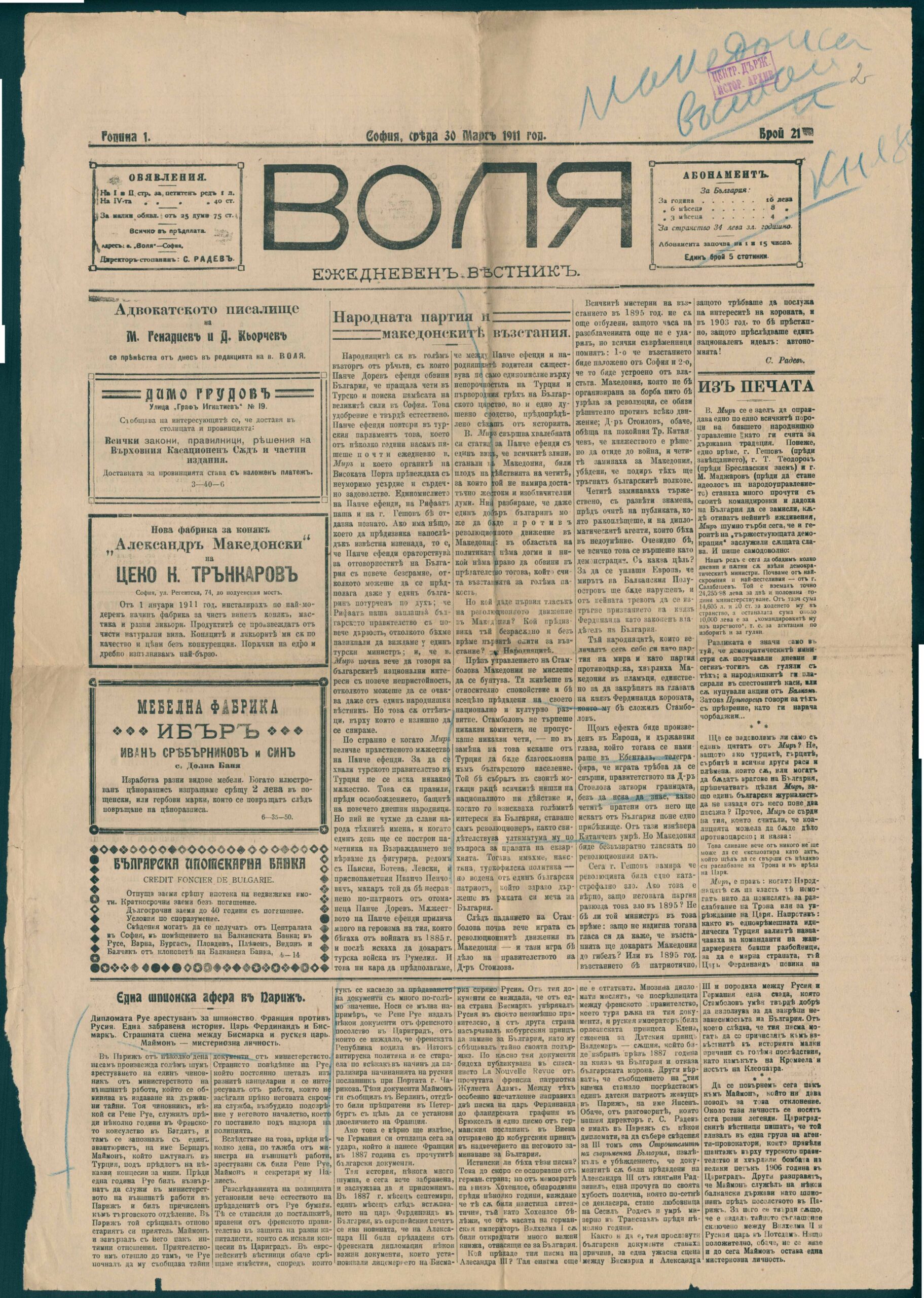 През пролетта на 1911 година излиза първият брой на ежедневника „ Воля “ с директор-стопанин Симеон Радев. Вестникът е определян в библиографски справочници и проучвателен текстове като вестник на Народнолибералната партия или обвързван с крилото на Никола Генадиев в тази партия (партийно издание е и в. „ Нов век “, с подзаглавие Орган на Народната демократична партия).