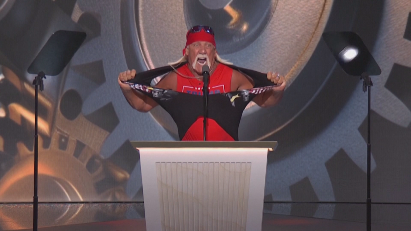 В поддръжка на републиканския претендент излезе и легендата на кеча Хълк Хоган, който раздра тениската си и прикани да се гласоподава за Тръмп.