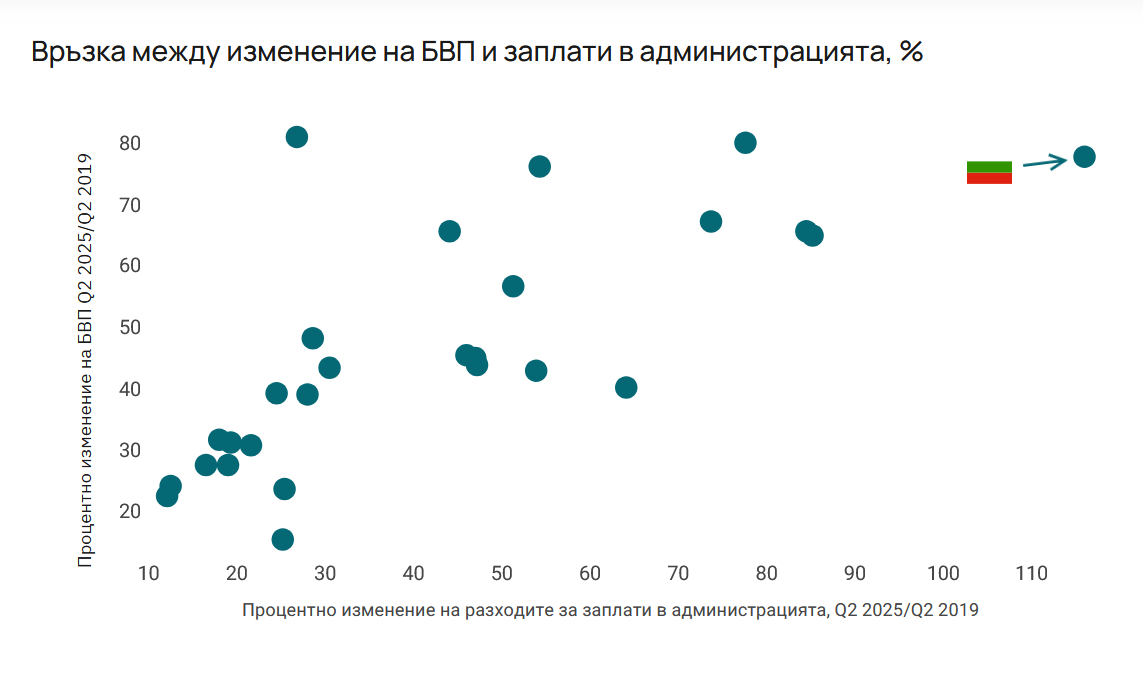 За интервала от второто тримесечие на 2019 година до второто тримесечие на 2025 година България регистрира най-голям номинален растеж на заплатите на заетите в обществената администрация и сигурността в Европейския съюз – 116% или повече от удвояване. За същия интервал номиналният растеж на Брутният вътрешен продукт е повишен със 79,6% – също много висок ритъм, само че въпреки всичко с над 36 процентни пункта по-нисък.