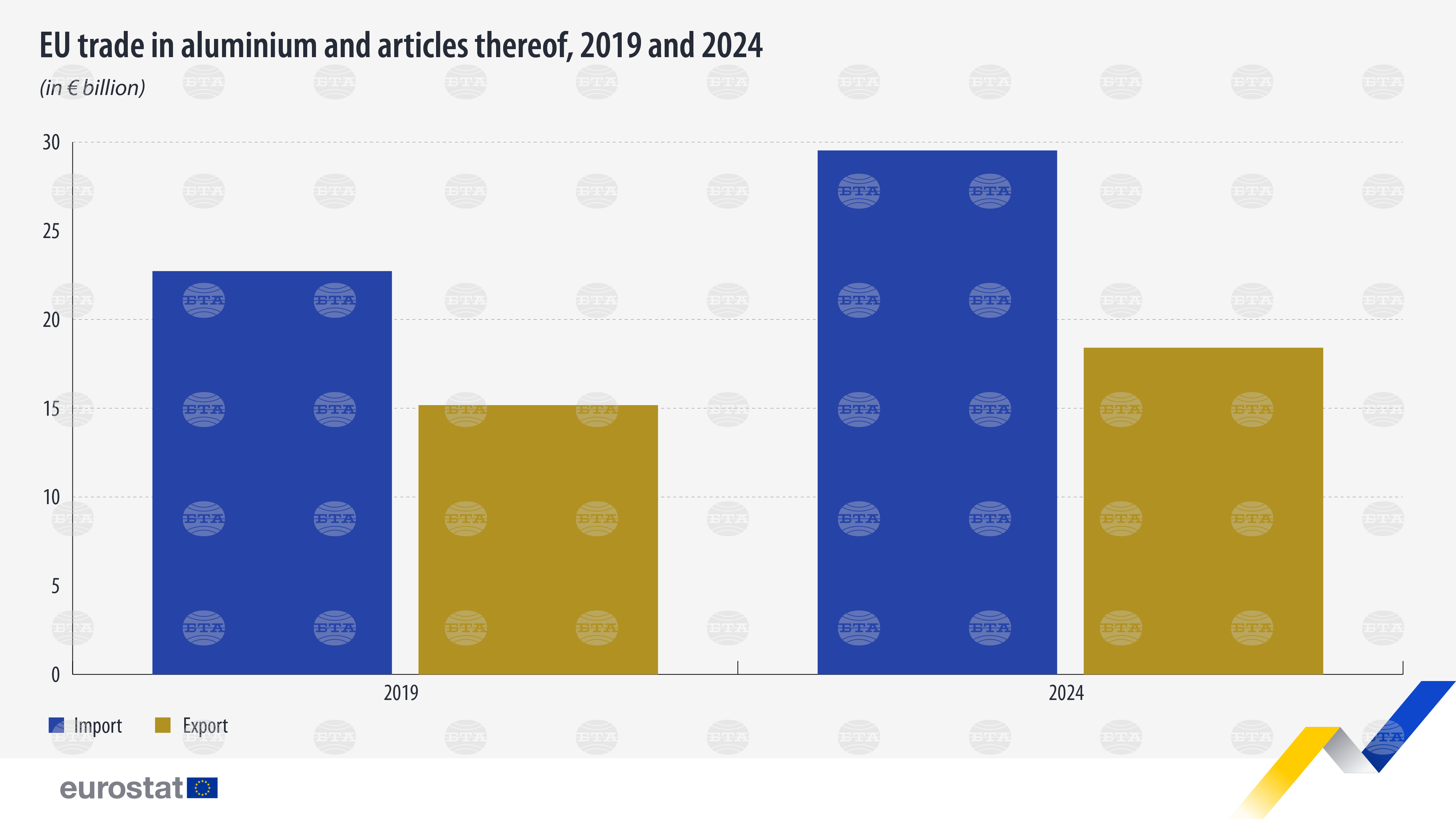 Вносът на алуминий и свързани артикули през 2024 година е повишен с 29,9% или 6,8 милиарда евро спрямо 2019 година.