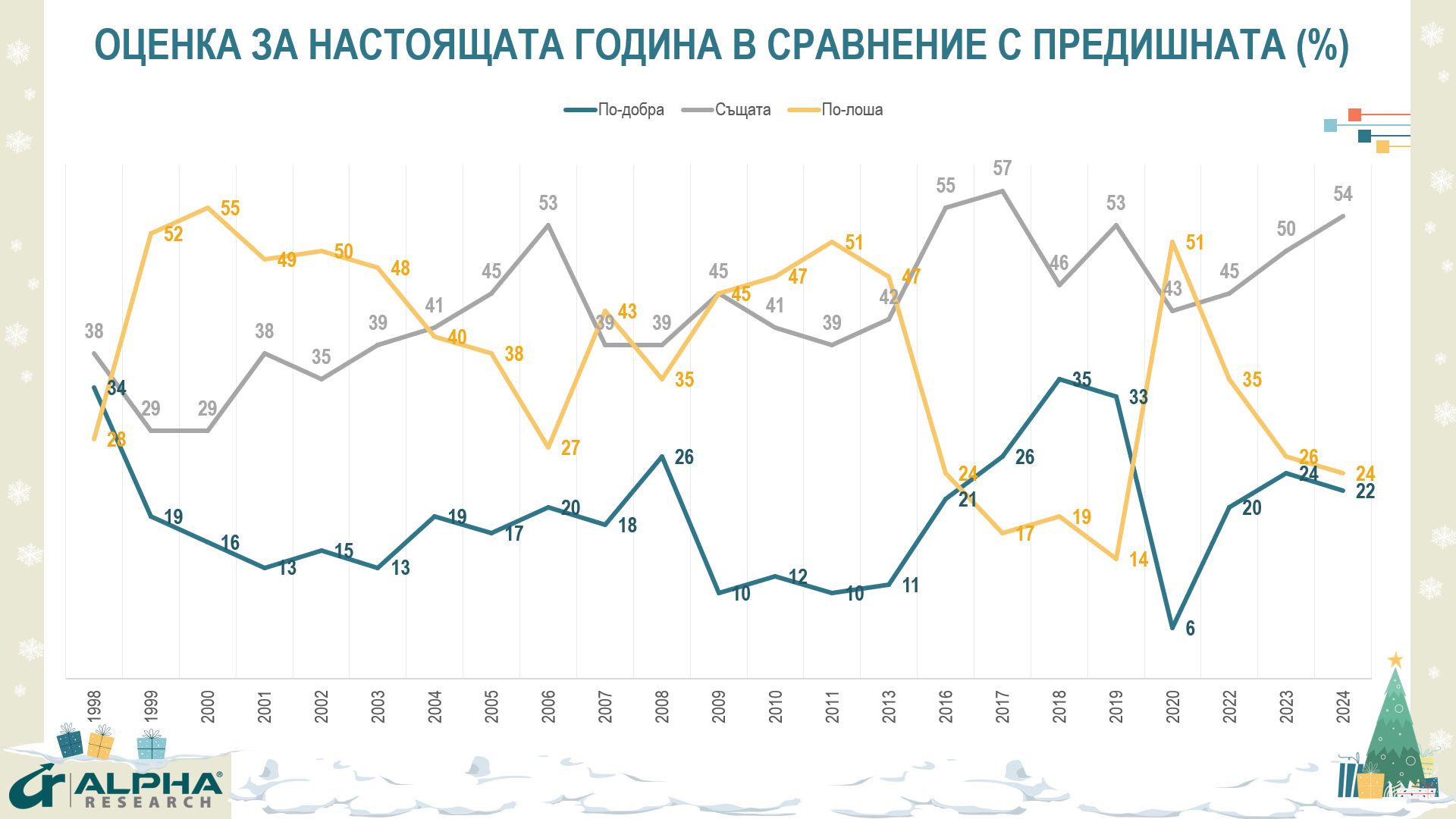Вече четвърт век в края на всяка календарна година Алфа Рисърч насочва компаса на публичните настройки към равносметката и очакванията – в опит да разберем по какъв начин и в каква посока се трансформира обществото ни, какви са вътрешните ни запаси, научените и ненаучените уроци, с които влизаме в идната година.