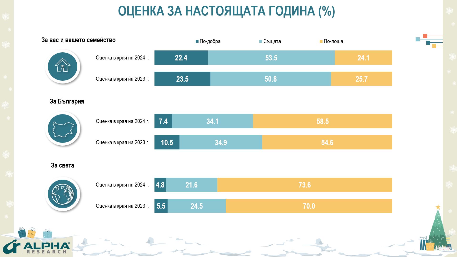 На фона на продължаващата война в Украйна и Близкия Изток, на покачващо се напрежение в редица региони на света и новите политически действителности в основни страни, най-песимистични и влошаващи се, са оценките за изтеклата година в световен проект. Едва 4.8% считат, че тя е била по-добра от предходната, а три четвърти (74%) са на мнение, че обстановката в света става все по-критична, несигурна и взривоопасна.