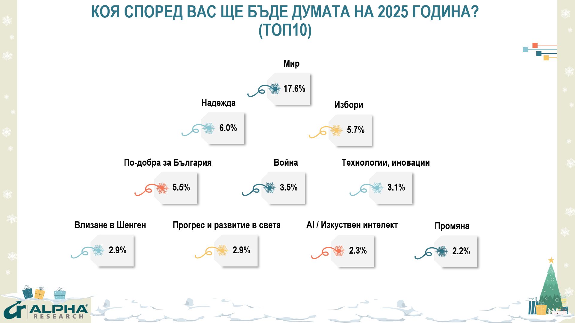 Открехването обаче на завесата каква 2025г. желаят да видят хората, доста ясно демонстрира посоката и на опасенията, и на стремежите. На въпрос каква съгласно тях ще е думата на 2025г. се обрисуват три фокуса: Фокус върху геополитиката и световното – мир (най-често споменаваната дума – 18%) в съпротива на войната (4%); Фокус върху технологиите, нововъведенията, изкуствения разсъдък като път към напредъка и развиването (общо 8%); Фокус върху България – вероятността за засилващата се евроинтеграция с влизането в Шенгенското пространство (2.9%), късмет за разцвет (5.5%), само че и … отново избори (5.7%).