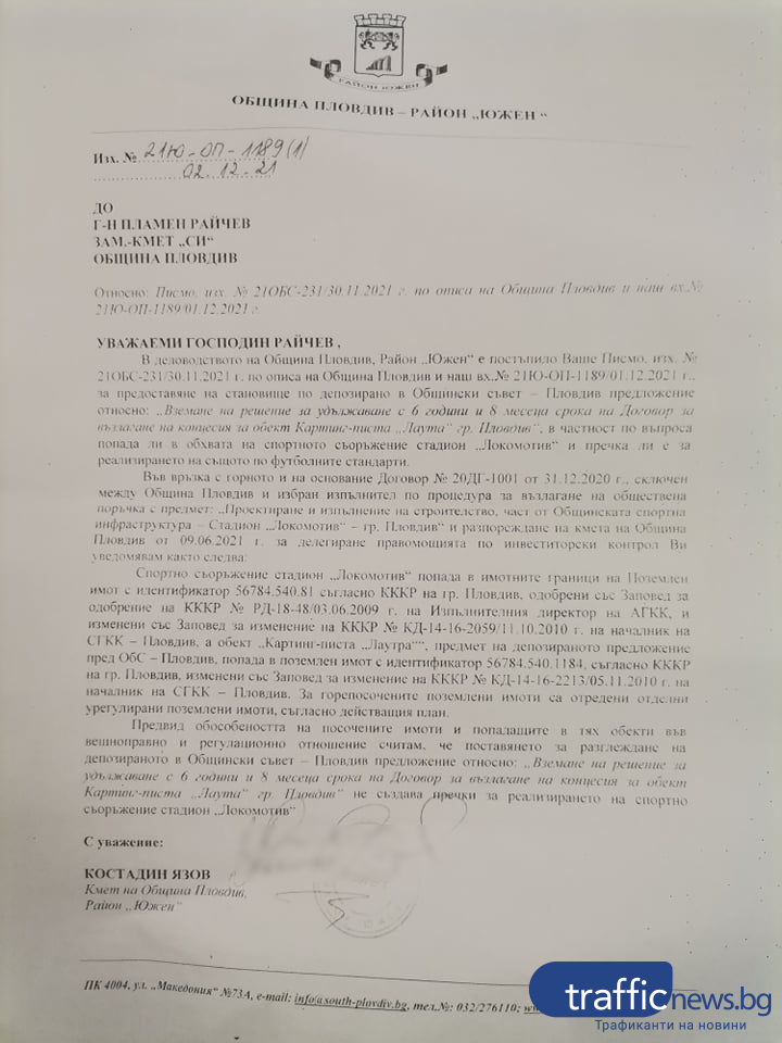„ Внесли сме искане за удължение на периода за концесия. Това съставлява главно право по контракта. Становище на правната комисия почете това право. Становище на основния проектант показва, че стадионът се намира в напълно настрана крило от картинг пистата. В отговор до зам.-кмета Пламен Райчев от регион „ Южен “ се показва, че, според настоящия проект, за поземлените парцели на Стадиона „ Локомотив “ и Картинг-пистата „ Лаута “ са отредени обособени УПИ-та “, съобщи Ивайло Цонев.