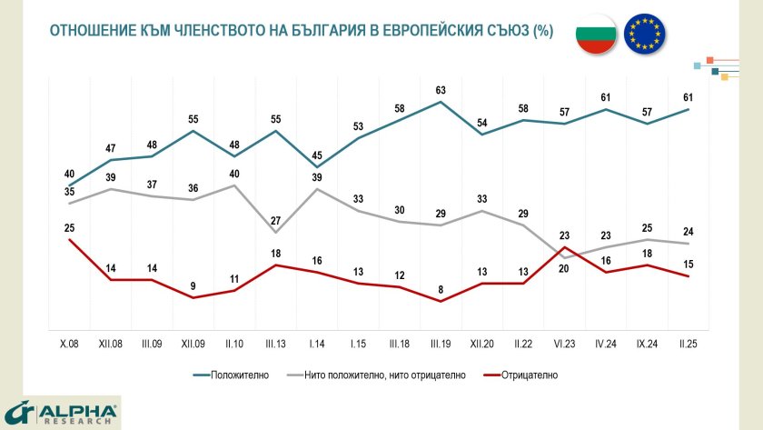 Според 59% от българите страната ни би трябвало да пази общите позиции на Европейски Съюз. Това сподели национално представително изследване на организация " Алфа Рисърч ", извършено в интервала 20 – 28 февруари 2025г. измежду извадка от 1000 пълнолетни души. От септември 2024г. до февруари 2025г. е налице даже растеж на поддръжката за участието на страната ни в Европейски Съюз – от 57 на 61 на 100, което съвсем се изравнява с исторически най-високите стойности по този индикатор. Негативните отзиви остават четири пъти по-ниски (15 на сто), а колебаещите се да изразят позиция се резервират в границите на една четвърт.