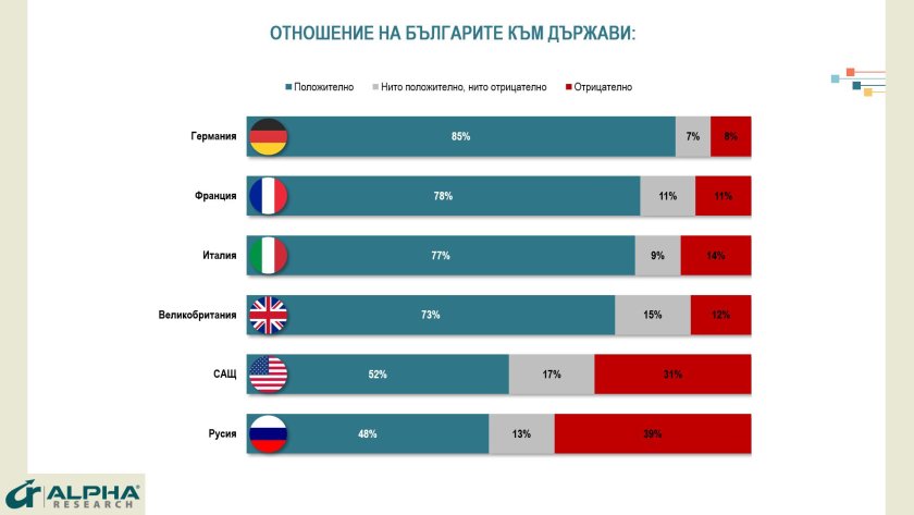 Държавите, които демонстрират най-големи старания Европа да стартира интензивно да отстоява своите позиции и да лидират процеса по постигането на дълготраен мир в Украйна, също срещат преобладаващо утвърждение – Германия се употребява с 85% доверие, Франция - 78%, Италия - 77%, Англия - 73%. Положително отношение към Съединени американски щати заявяват 52%, а към Русия 48% от пълнолетните поданици на страната.