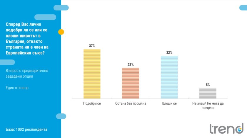 Според 37% от респондентите животът в България се е подобрил, откогато страната е член на Европейски Съюз, 23% считат, че е останал без смяна, 32% са дали отговор, че се е влошил. Общо 8% не могат да преценяват.