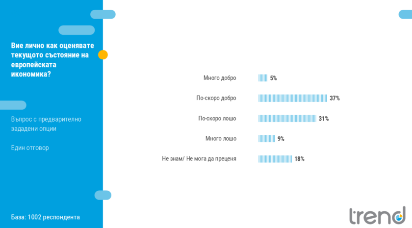 Попитани по какъв начин правят оценка настоящото положение на европейската стопанска система, 5% са дали отговор с " Много добре ", 37% - " По-скоро добре ", 31% - " По-скоро неприятно ", 9% - " Много неприятно ", а 18% не знаят.
