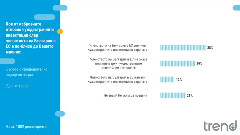 Членството на България в Европейски Съюз усили задграничните вложения в страната, считат 38% от интервюираните, а съгласно 29% не е оказало въздействие. Членството в Европейски Съюз е понижило задграничните вложения, е мнението на 12%, а 21% не могат да преценяват.