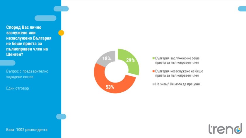 България несправедливо не беше призната за пълновръстен член на Шенген, считат 53% от интервюираните. Според 29% страната ни справедливо не беше призната за пълновръстен член, а 18% са дали отговор, че не могат да преценяват.
