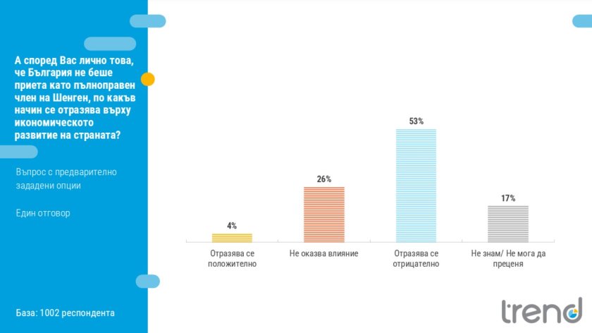 На въпрос " Според Вас персонално това, че България не беше призната като пълновръстен член на Шенген, по какъв метод се отразява върху икономическото развиване на страната " 4% са дали отговор " позитивно ", 53% - " негативно ", а съгласно 26% не оказва въздействие. Общо 17% не могат да преценяват.