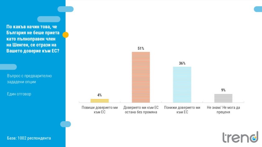 Попитани по какъв начин неприемането ни за пълновръстен член на Шенген се е отразило на доверието им към Европейски Съюз, 4% от респондентите са дали отговор с " Повиши доверието ми към Европейски Съюз ", 51% - " Доверието ми към Европейски Съюз остана без смяна ", 36% - " Понижи доверието ми към Европейски Съюз ". " Не мога да преценява " са показали 9% от участвалите в изследването.