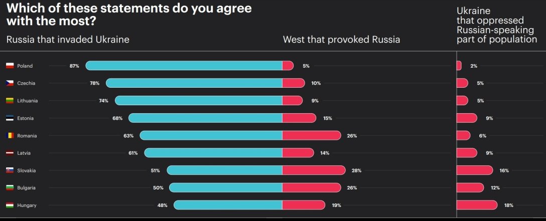Най-малък брой от тези, които считат Украйна за виновна за войната, са Полша (2%), Чехия (5%), Литва (5%) и Румъния (6%).