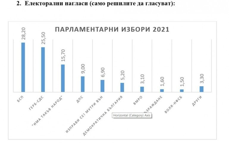 Според организацията на Калоян Методиев въз основата на последното проучване на РЕГО (Х 2020) ясно се виждало, че Българска социалистическа партия бележи растеж измежду желанията на гласоподавателите, до момента в който ГЕРБ очевидно свива поддръжката си в народен мащаб. Очевидно проблемите с ръководството на Ковид рецесията – първото място по смъртност и последно по имунизации в Европа са повлияли на гласоподаватели за ерозията на поддръжка към ръководещите през втората половина на предизборната акция, считат от „ Рего “. Любопитно е, че Българска социалистическа партия се радва на електорална поддръжка най-много измежду най-възрастните и млади гласоподаватели – над 60 години и до 30 години. Тя е желана и повече измежду дамите. При ГЕРБ поддръжката идвала от междинната възраст и е полово уравновесена. Формацията на Слави Трифонов трайно се е открила на третото място. Тя среща главните си поддръжници измежду младите до 30 годишна възраст. При Движение за права и свободи, Демократична България и обединението към Мая Манолова резултатите ще зависят от няколко съществени фактора – степен на готовност, прикрит избор, привличане или загуба на външна страна. Целият букет от националистически обединения остава отвън Народното събрание, съгласно изследването. При Движение за права и свободи и Демократична България обичайно се прибавя избор от чужбина, който подвига резултата им. При електорални партии като „ ИТН “ по принцип има висока степен на прочувствено предпочитание за гласоподаване, само че постоянно този избор, главно юношески, не отива в дисциплинирано до урните. От тези специфики са вероятни съмнения на резултатите по посока на покачване при Движение за права и свободи и Демократична България и понижение на резултата при „ ИТН “. В желанията за нов министър председател на страната преобладават мненията, че няма подобаваща персона (24 %). Лидерът на Българска социалистическа партия – Корнелия Нинова е най-предпочитаният политик за предстоящ министър-председател (19.2%), до момента в който настоящият министър председател е посочен като желание от 17.1 %. Слави Трифонов е желан от 9 % от респондентите.